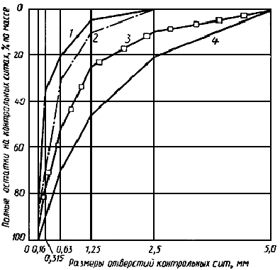 3.10. Для бетонов гидротехнических сооружений допускается применять пески с модулем крупности от 1,5 до 3,5 (полные остатки на сите размером 2,5 мм от 0 до 30%, на сите 1,25 мм - от 5 до 55%, на сите 0,63 мм - от 20 до 75%, на сите 0,315 мм - от 40 до 90% и на сите 0,14 мм - от 85 до 100%). При этом мелкие пески с модулем крупности, равным или менее 2,0, должны использоваться при обязательном применении поверхностно-активных добавок.